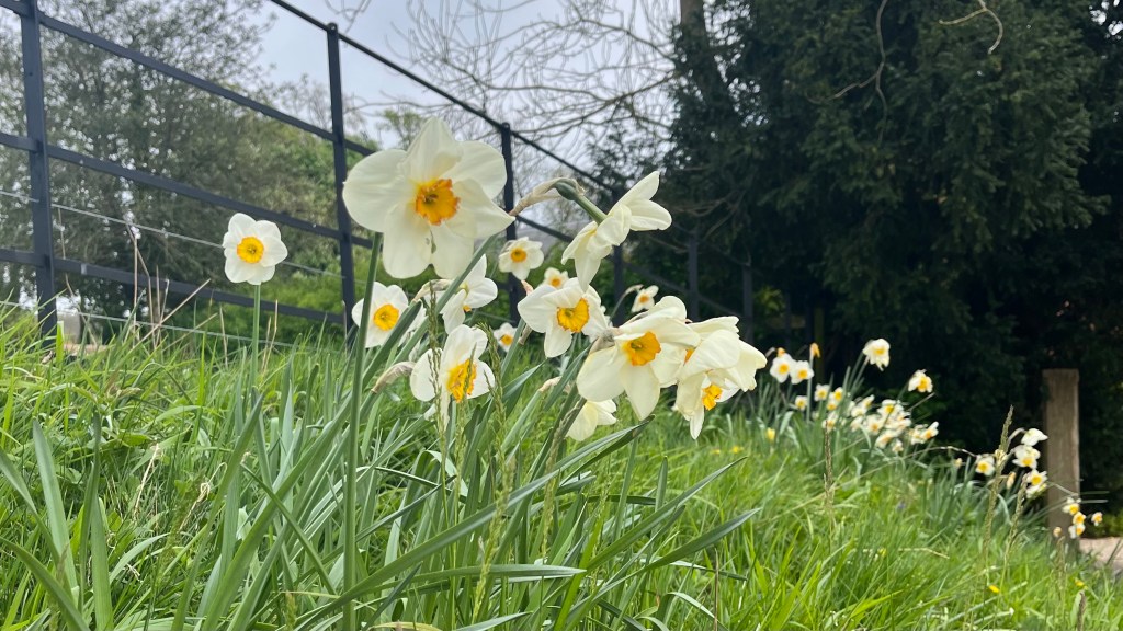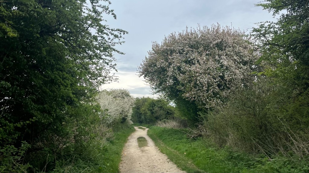 Apple trees were today’s designated path-liners, their blossoms a lovely focal point against the moody sky. A light drizzle began, the kind that doesn’t quite justify a rain jacket. Until you try to stop for a snack. On Coombe Hill the wind arrived and the rain began in earnest; fat drops splattered and I scrambled for my waterproofs. Clearly a break was not in the cards, so I moved onwards as a massive bird of prey played in the updrafts.
