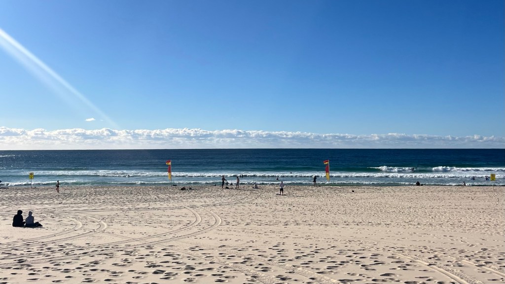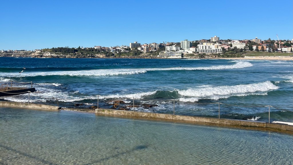 I reach Bondi Beach just after 7.30am and it’s already alive with runners, walkers, surfers, swimmers and sun-chasers. The sand is patterned with footprints and the clear water shifts from vibrant turquoise to deep, foaming blue.