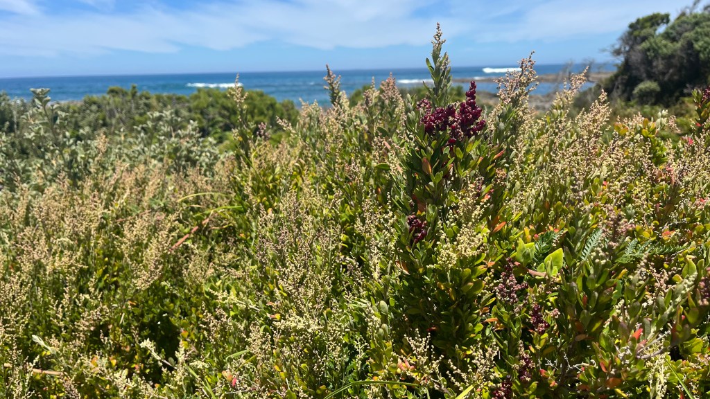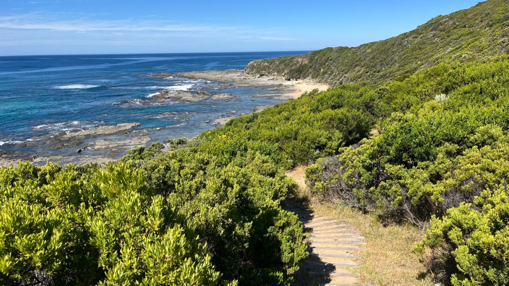 Parkers Inlet is an easy crossing. The stairs on the far side are not. After the shade of the forest, being forced to climb so steeply upwards in the direct sunlight is a challenge that has me stopping frequently for water breaks. The next stretch is similarly light on shade as I traverse through coastal scrub as the heat of the day continues to build. By the time Cape Otway Lighthouse appears on the horizon, I’m fantasising about a cold drink. Miraculously, the cafe is open so my dream is manifested; even better, they give me a handful of spoons. Breakfast is back on.