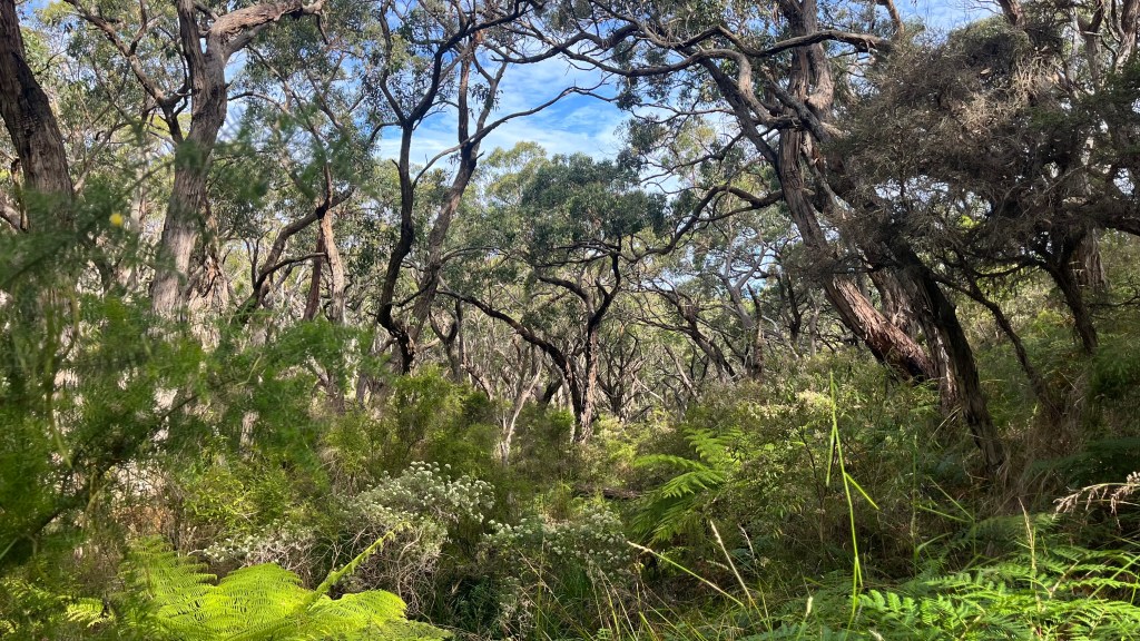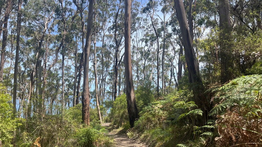 Cloud cover greets me this morning, and I’m grateful for it: after yesterday’s heat, the cooler air feels like an ally. A brief section of farmland brings flies and a mob of kangaroos that are unimpressed with me, but soon I’m back in tall eucalypt forest striding along a wide access track where the progress finally feels easy.