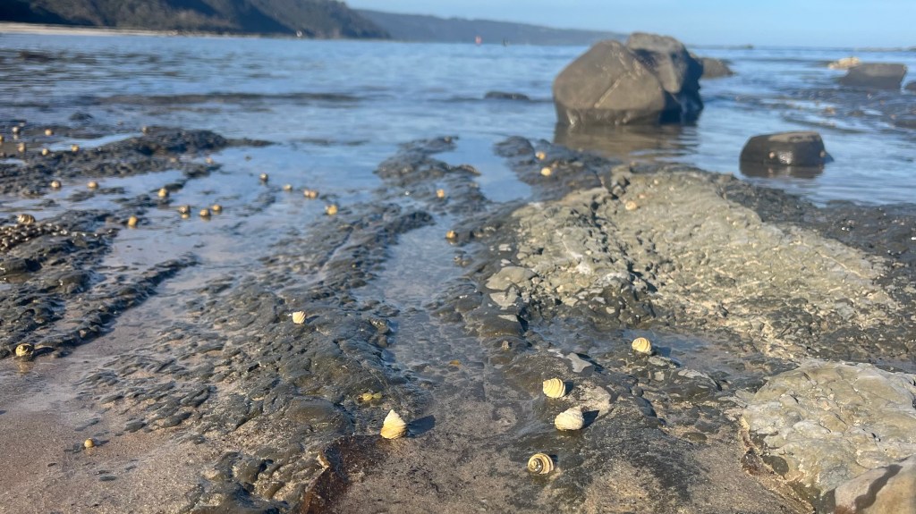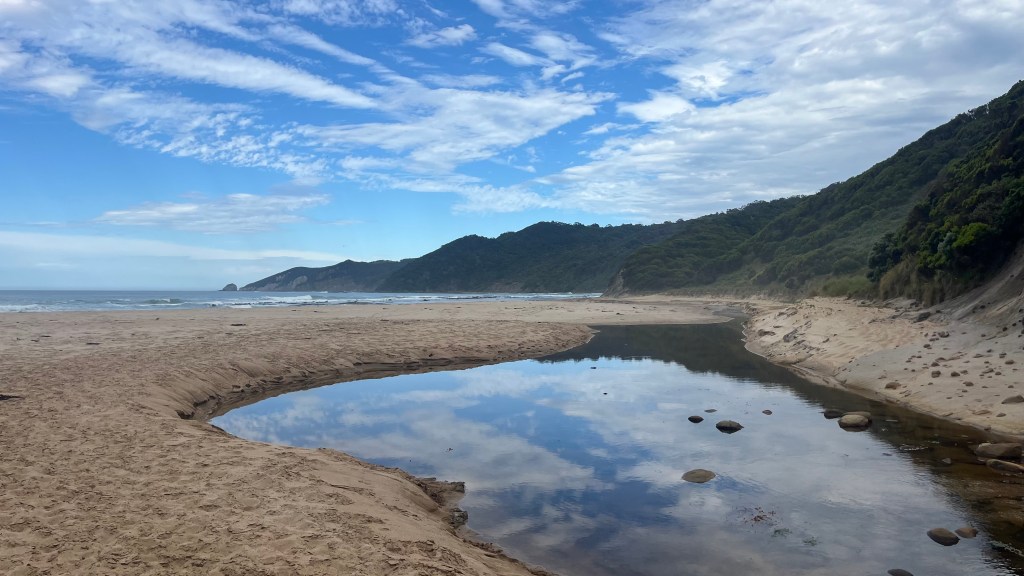Moving on quickly, Station Beach soon comes into view. The flies have been descending upon me in force, and I opt for taking the beach alternate so I can shake them for a while. The wind works its magic, and I make the out-and-back detour to Rainbow Falls pack-free. Luxury. But re-shouldering my pack for the remaining beach walk is tougher than anticipated. The walking is slow, the sun relentless, and the beach stretches endlessly ahead. I’m relieved when I arrive at the steep uphill section that will deliver me back to the trail proper.