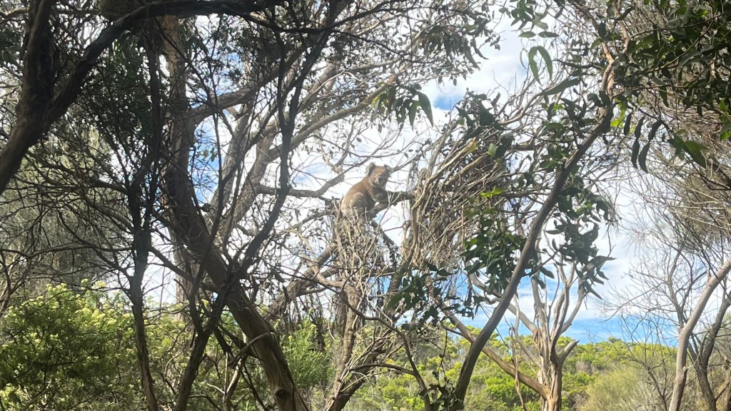 After a good rest I push on, but I’m becoming sluggish in the heat. The trail gifts me with a small patch of forest, where I rest to cool down; and then a further gift when a koala appears, freezing upon the sight of me to watch with suspicion. It feels like a sign that I’ve got this.