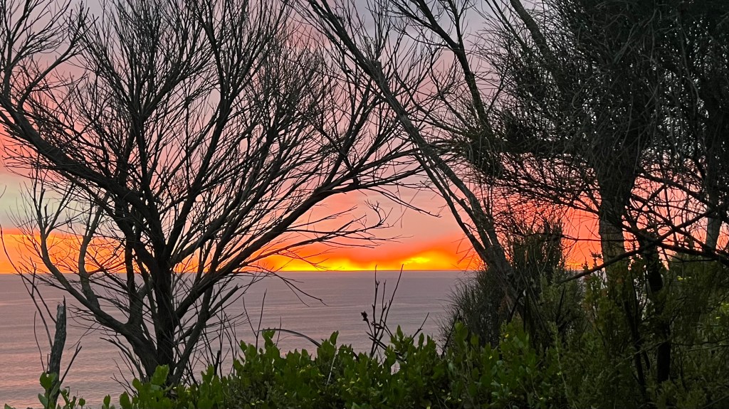 More forest and scrub follows, and Johanna Beach finally appears. Walking along it is beautiful and brutal, in equal measure. The sand is unforgiving, the inlet requires a switch to sandals, and the final climb and extra kilometres up to the walk-in campground are merciless. I roll into camp at sunset, accidentally pitch on a nest of bull ants, re-pitch far away from them, and then finally sit down for dinner. The reward, though, is worth it: the sky ignites in flaming pink and orange as the sun sinks on a spectacular day of trail.